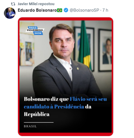 A publicação traz uma foto do filho mais velho do ex-presidente Jair Bolsonaro com a legenda "Bolsonaro diz que Flávio será seu candidato à Presidência da República". Milei compartilhou o post no X (antigo Twitter).